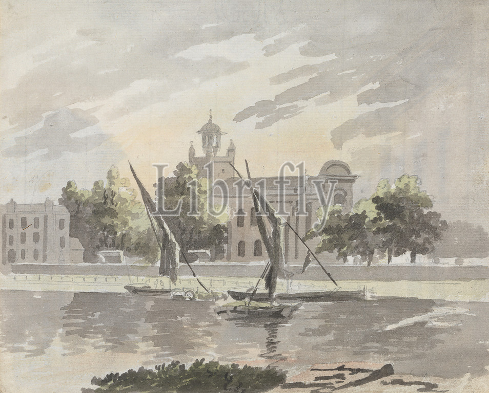 View, Isleworth Church, James Miller, active 1773–1814, Watercolor graphite, pen, black ink, medium, moderately textured, blued white, laid paper, Sheet, Mount, architectural subject, boats, church, dinghy, dock, river, riverbank, sails, trees, turrets, Saints Church, England, Hounslow, Isleworth, London, Thames, United Kingdom, Westminster Abbey