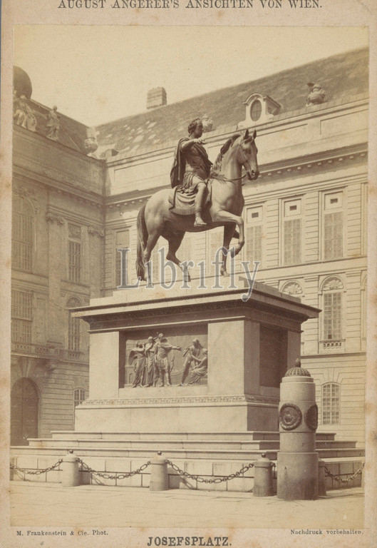 View, Josefsplatz, Vienna, equestrian statue, Joseph II, Franz Anton Zauner, Josefpatz, August Angerer's Ansichten von Wien, series title, M, Frankenstein & Co, mentioned, Vienna, c, 1875, c, 1885, photographic support, cardboard, albumen print, height 140 mm, width 100 mm