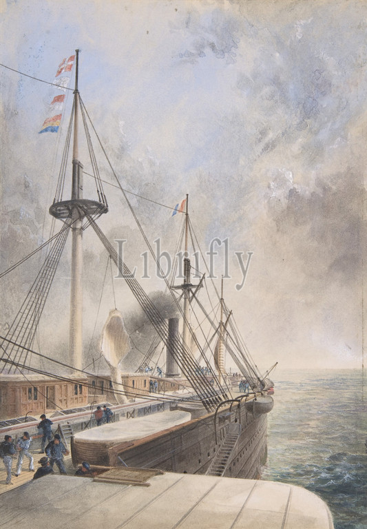 View Looking Aft, Port Paddle-box, Deck, Great Eastern, Showing, Trough, Cable, etc, 1865–66, Watercolor, touches, gouache, Sheet, 8 15/16 x 6 1/4, 22.7 15.9 cm, Drawings, Robert Charles Dudley, British, 1826–1909, 19th century, great technological achievements, lay, telegraphic cable, beneath, Atlantic, allowing messages, speed back, forth, North America, Europe, minutes, ten, twelve days, steamer
