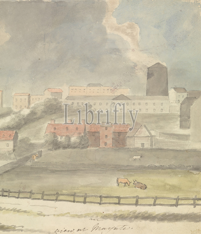 View at Margate, Edward Francis Burney, 1760–1848, British, undated, Watercolor and pen and black ink on medium, slightly textured, cream wove paper, Sheet: 6 1/8 × 7 1/8 inches (15.6 × 18.1 cm), clouds, cows, farm, fence, landscape