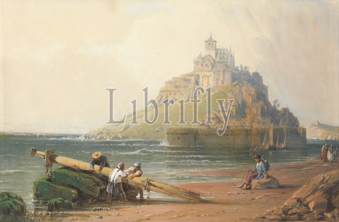 View, Mont St, Michel, Figures, Beach, William Wyld, 1806–1889, British, Watercolor, gouache, graphite, medium, slightly textured, cream wove paper, Sheet