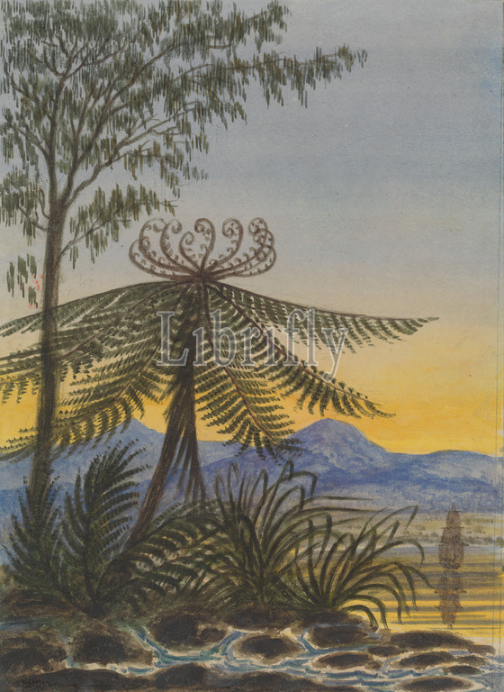 View, Auckland, Evening-Trees, Ferns, Lt, Gen, Charles Emilius Gold, 1803?–1871, ca, 1849, Watercolor, graphite, moderately thick, slightly textured, blued white wove paper, Sheet, ferns, landscape, light, mountains, ship, sunset, trees, Auckland, Auckland, New Zealand, North Island, Oceania