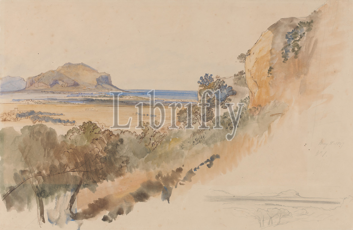 View, Palermo, Edward Lear, 1812–1888, British, 1847, Watercolor, pen, brown ink, graphite, moderately thick, moderately textured, beige wove paper, Sheet, Grand Tour, hills, landscape, rocks, landforms, sea, sky, studies, visual works, Italy, Palermo, Sicily, Tyrrhenian Sea