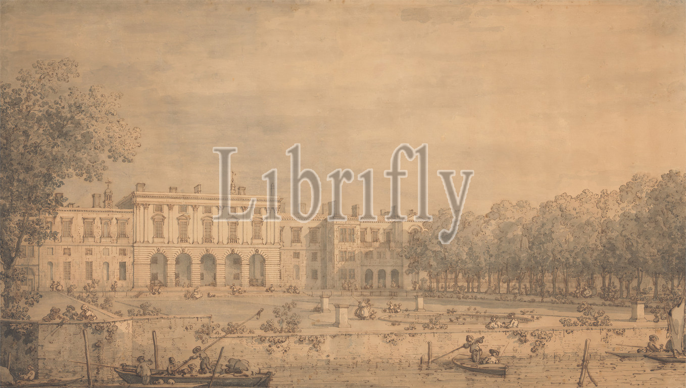 View, Old Somerset House, Thames, Canaletto, 1697–1768, Venetian, active, Britain, 1746–55, Pen, brown ink, watercolor, gray wash, medium, slightly textured, cream laid paper, Sheet, arches, architectural subject, architecture, boats, chimneys, columns, garden, genre subject, pedestals, pond, river, trees, wall, England, London, Somerset House, Thames, United Kingdom