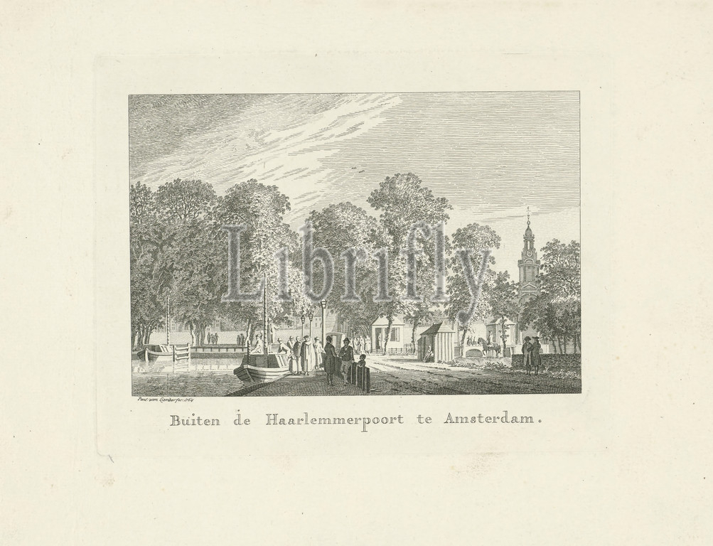 View outside the Haarlemmerpoort in Amsterdam Outside the Haarlemmerpoort in Amsterdam (title on object), View outside the Haarlemmerpoort in Amsterdam. At the beginning of the Haarlemmerweg and the Haarlemmertrekvaart, passengers board a barge. On the right in the background is the Haarlemmerpoort. This Haarlemmerpoort designed by Hendrik de Keyser was built between 1615 and 1618, city gate, canal, traffic on the water, Haarlemmerpoort, Haarlemmertrekvaart, Paulus van Liender (mentioned on object), Amsterdam, 1764, paper, engraving, h 148 mm × w 190 mm