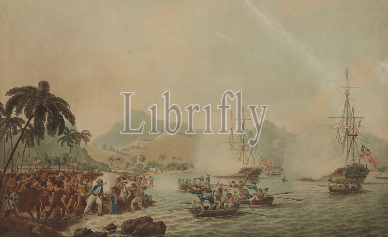 view, Owhyhee, Sandwich Islands, John Cleveley Junior, artist, 1787-88, aquatint, John Cleveley Junior bore, name, father, artistic skills, John received lessons, Paul Sandby, Chief Drawing Master, Woolwich, came, specialise, shipping, riverside scenes, chosen, join, Resolution, Joseph Banks' natural history draughtsman, Captain Cook's second voyage, Pacific, 1772-75, Banks' plans fell, John, accompanied, journey, Orkneys, Hebrides, Iceland, 1772