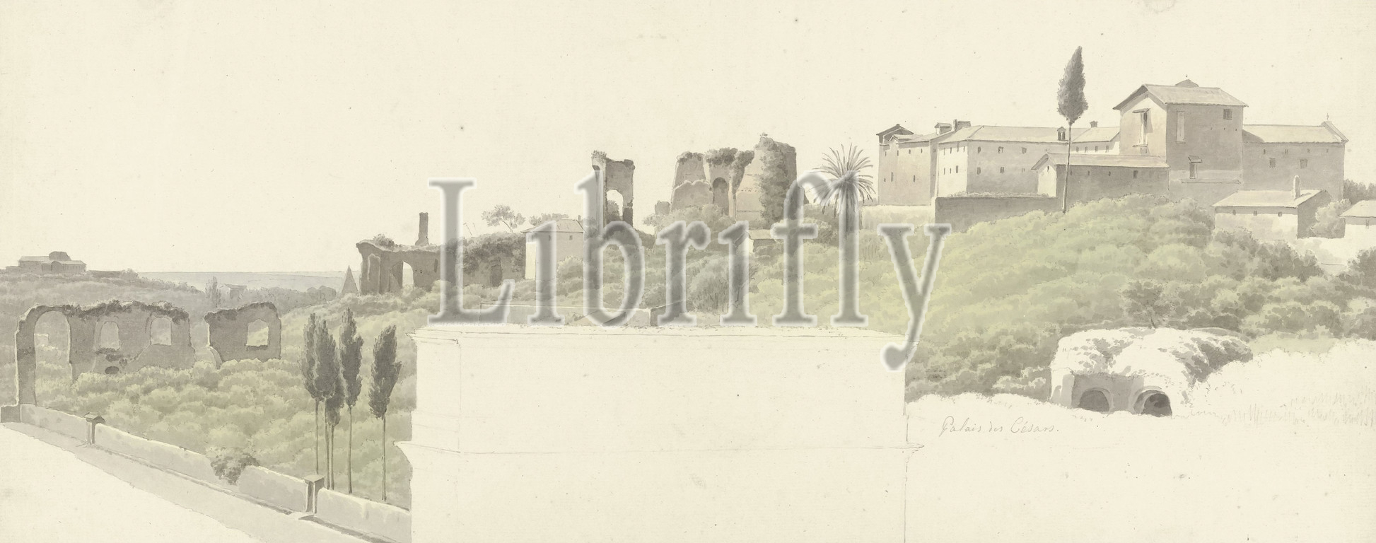 View of the Palatine Hill in Rome, with the Arch of Constantine View of the Palatine, with the silhouette of the Arch of Constantine in the foreground, Drawing from a group of 46 drawings and studies of mainly cityscapes and landscapes in and around Rome., landscape with ruins, ruins of a building, architecture, Palatine, Arch of Constantine, Josephus Augustus Knip, Italy, c. 1809 - c. 1812, paper, graphite (mineral), watercolor (paint), brush, h 218 mm × w 538 mm