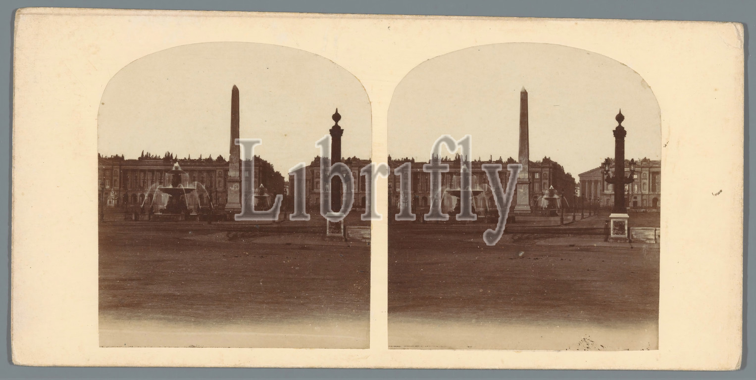 View, Place de la Concorde, Paris, fountain, Luxor obelisk, square, place, circus, etc, ornamental fountain, monument, statue, c, 1850, 1880, photographic paper, cardboard, albumen print
