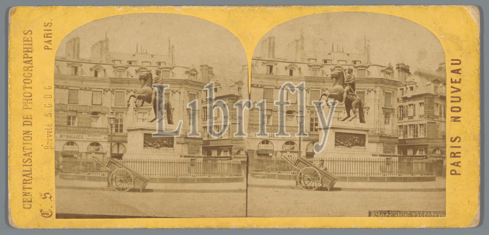 View, Place des Victoires, Paris, equestrian statue, Louis XIV, France, title, object, Paris Nouveau, series title, square, place, circus, etc, King, Centralisation de Photographies, mentioned, c, 1850, 1880, photographic paper, cardboard, albumen print