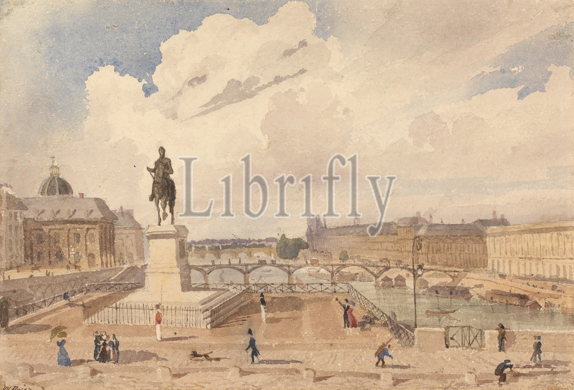 View from the Pont Neuf, William Henry Lake Price, ca. 1810–ca. 1896, undated, Watercolor and graphite on medium, rough, cream wove paper, Sheet: 6 1/2 × 9 1/2 inches (16.5 × 24.1 cm), bridge (built work), buildings, cityscape, figures, river, statues, Europe, France, Paris