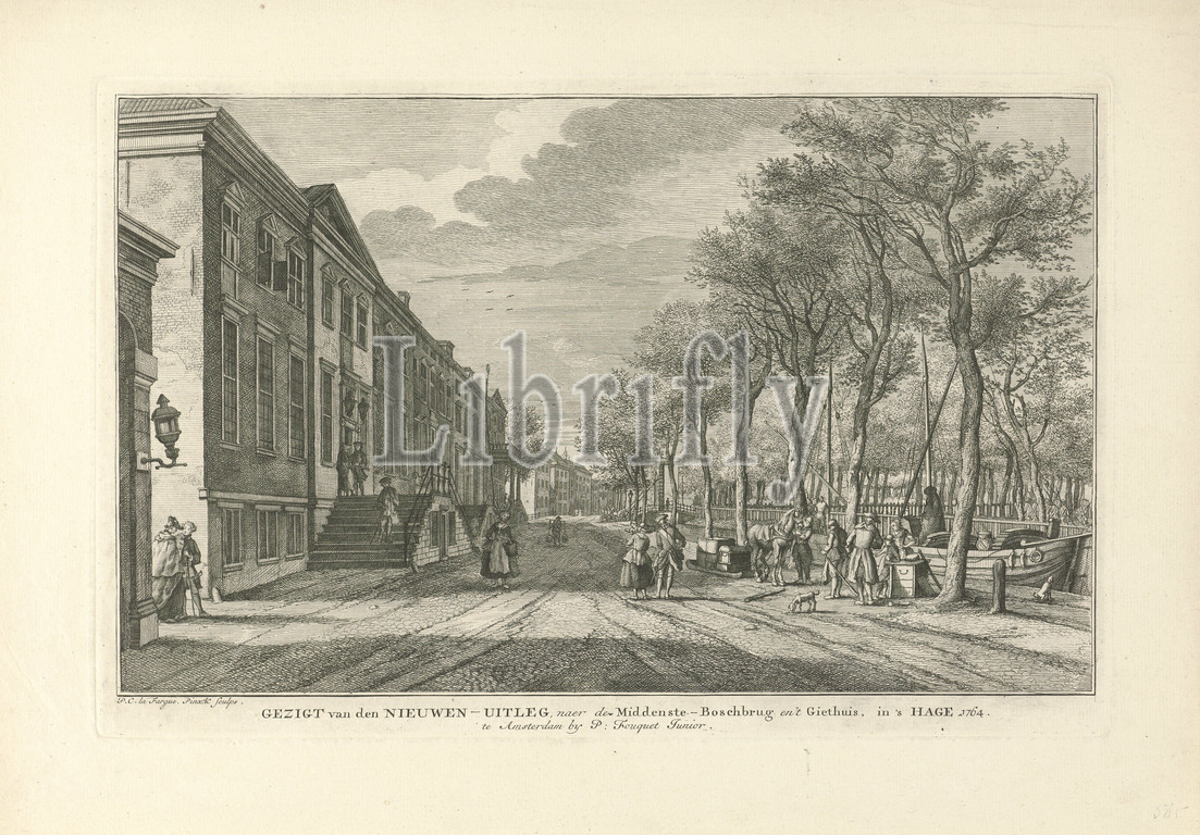 View of the Prinsessegracht in The Hague View of the Nieuwen-Uitleg, after the Middenste-Boschbrug and 't Giethuis, in' s Hage (title on object) Eight faces in The Hague ( series title), View of the Prinsessegracht, located on the 'island' of the Nieuwe Uitleg, in The Hague, in the direction of the Bosbrug and the corner with the Korte Voorhout. In the foreground left the building of the French embassy on the corner with the Casuariestraat. On the other side of the canal, the Koekamp park is on the right. Print from a series of eight faces in The Hague, city view, and landscape with man-made constructions, street (cityscape with figures, staffage), bridge in city across river, canal, etc, Prinsessegracht, Korte Voorhout, Koekamp, Bosbrug, Paulus Constantijn la Fargue (mentioned on object), 1764, paper, engraving, h 269 mm × w 412 mm