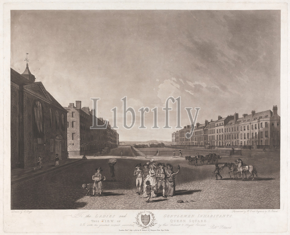 View, Queen Square, Robert Pollard, 1755–1838, British, Robert Dodd, 1748–1816, British, Edward Dayes, 1763–1804, British, 1789, Etching, aquatint, moderately thick, moderately textured, cream, laid paper, Sheet, Plate, Image, apron, architectural subject, barrels, beggar, boy, breeches, trousers, buildings, carriage, carrying, cart, children, cityscape, clock tower, couple, dogs, animals, fashion, fences, flower basket, flowers, plants, genre subject, gown, hats, hills, horses, animals, lampposts, men, merchant, nobility, peasants, queen, person, square, statue, streets, tailcoats, tricornes, vendor, wagon, walking, weathervane, women, Bloomsbury, Camden, England, Greater London, Queen Square, United Kingdom