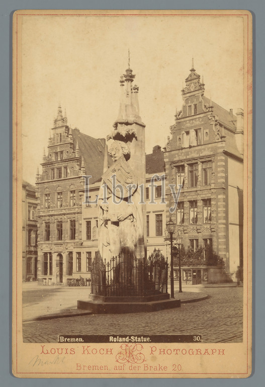 View, Roland's statue, Bremen Roland-Statue, title, object, monument, statue, Bremen, Louis Koch, mentioned, 1880, 1900, cardboard, photographic paper, albumen print