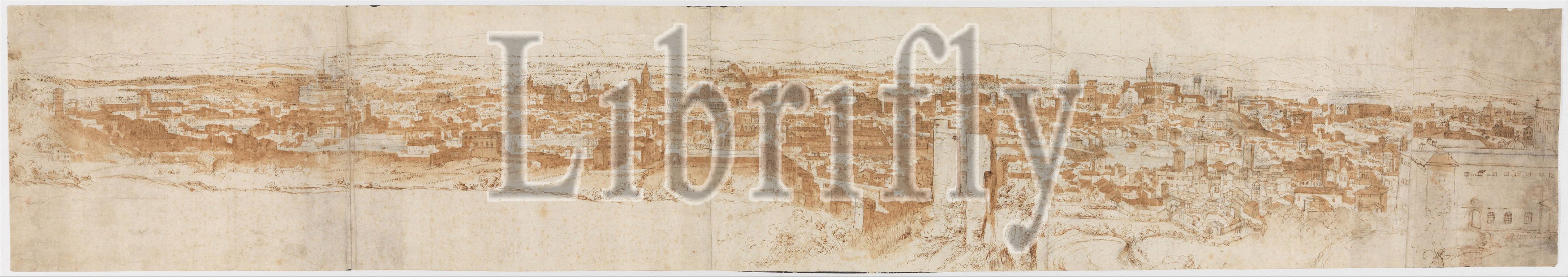 View, Rome, Janiculum, South-West, verso, Sketch, buildings, plants, ca, 1540–50, Pen, brown ink, brown, blue wash, black chalk, three pieces, paper glued together, Sheet, 51 3/16, 8 5/16, 130, 21.1 cm, Drawings, Anthonis van den Wijngaerde, Netherlandish, Antwerp, 1525–1571, Madrid, exceptionally large, drawing, detailed early, panoramas, view, Janiculum Hill, western part, city, site, American Academy