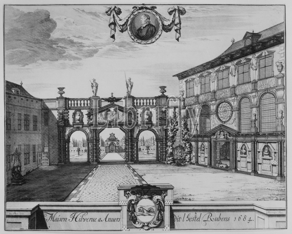 View, Rubenshuis, Antwerp, 1675–1732, Engraving, plate, 11 5/16 x 14 1/16, 28.7 35.7 cm, Prints, Engraved by Jacobus Harrewijn, Dutch, 1660–after, 1732, After J. van Croes