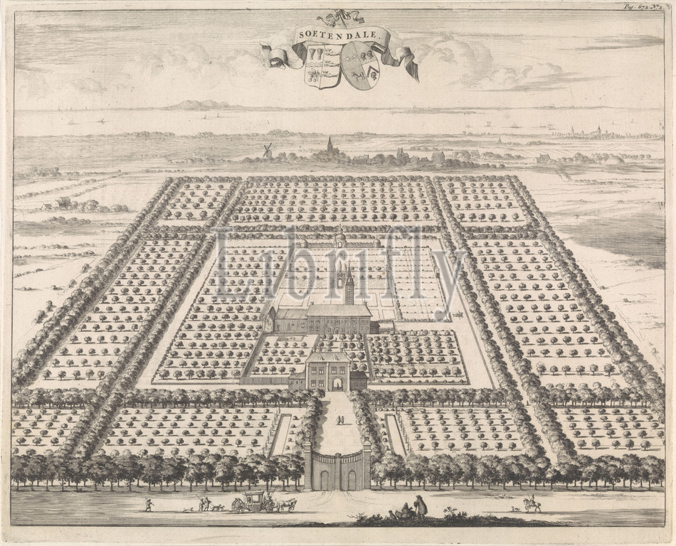 View of the Soetendale country estate Soetendale (title on object), View of the Soetendale country estate, located between Grijps- and Serooskerke on Walcheren, in a bird's eye view. Top in the middle a banderole with the title and below that the arms of owner Johan Steengracht on the left and that of his wife Barbara Veth on the right. Marked top right: Pag. 672. No. 2, country-house, prospect of village, silhouette of village, armorial bearing, heraldry (with NAME of family), gate, entrance, garden, orchard, Soetendale, Jan Luyken, 1696, paper, engraving, h 275 mm × w 342 mm