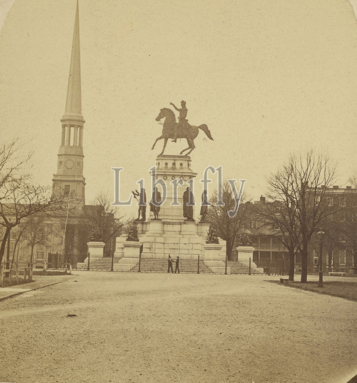 View, town square, statue, man, horse, center, Lee Gallery, 1870s, Albumen silver print
