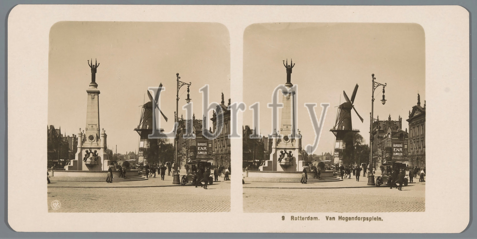 View, Van Hogendorpplein, Rotterdam Rotterdam, Van Hogendorpsplein, title, object, windmill, landscape, village square, place, monument, statue, Rotterdam, Neue Photographische Gesellschaft, mentioned, c, 1900, 1910, cardboard, photographic paper, gelatin black-and-white print