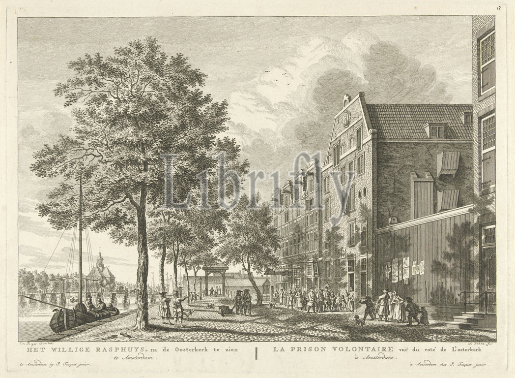 View of the Willige Rasphuis in Amsterdam The Willige Rasphuys, after seeing the Oosterkerk in Amsterdam / La Prison Volontaire cote de l'osterkerk à Amsterdam (title on object), View of the Willige Rasphuis on the IJgracht (current Prins Hendrikkade) in Amsterdam. On the left in the background is the Oosterkerk. In 1782 the prisoners of this institution moved to the new Spin and New Workhouse on the Weesperveld. From 1785 the building on the IJgracht was used as a training school for maritime navigation. Below the show the title in Dutch and French. Numbered top right with pen: 12 or 17, workhouse, penal camp, penitentiary, chain gang, prison, jail, Willige Rasphuis, Simon Fokke (mentioned on object), Amsterdam, 1760 - 1783, paper, engraving, h 275 mm × w 387 mm