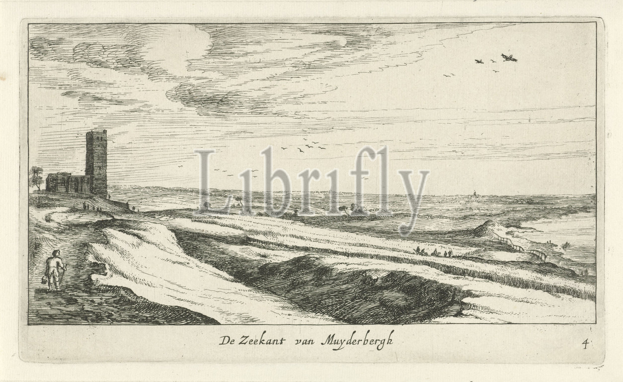 View of the Zuiderzee The Sea side of Muyderbergh (title on object) Plaisante Lantschappen ofte vermakelijcke Gesichten ( series title on object), View from Muiderberg on the Zuiderzee, with on the left the old church (nowadays called Kerk aan Zee) with its blunt tower. The print is part of a series of landscapes with villages around Amsterdam. Numbered lower right: 4., church (exterior), Zuiderzee, Muiderberg, Geertruydt Roghman, Amsterdam, 1637 - 1652, paper, engraving, h 120 mm × w 223 mm