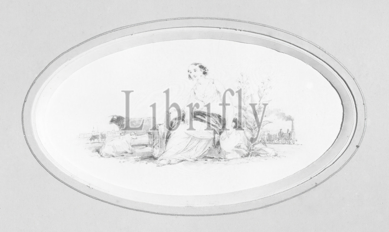 Vignette F, American, Watercolor, graphite, 1840s-1850s, 5 3/4 x 3 7/16, 14.6 x 8.7 cm, cows, drawing, graphite, watercolor, woman