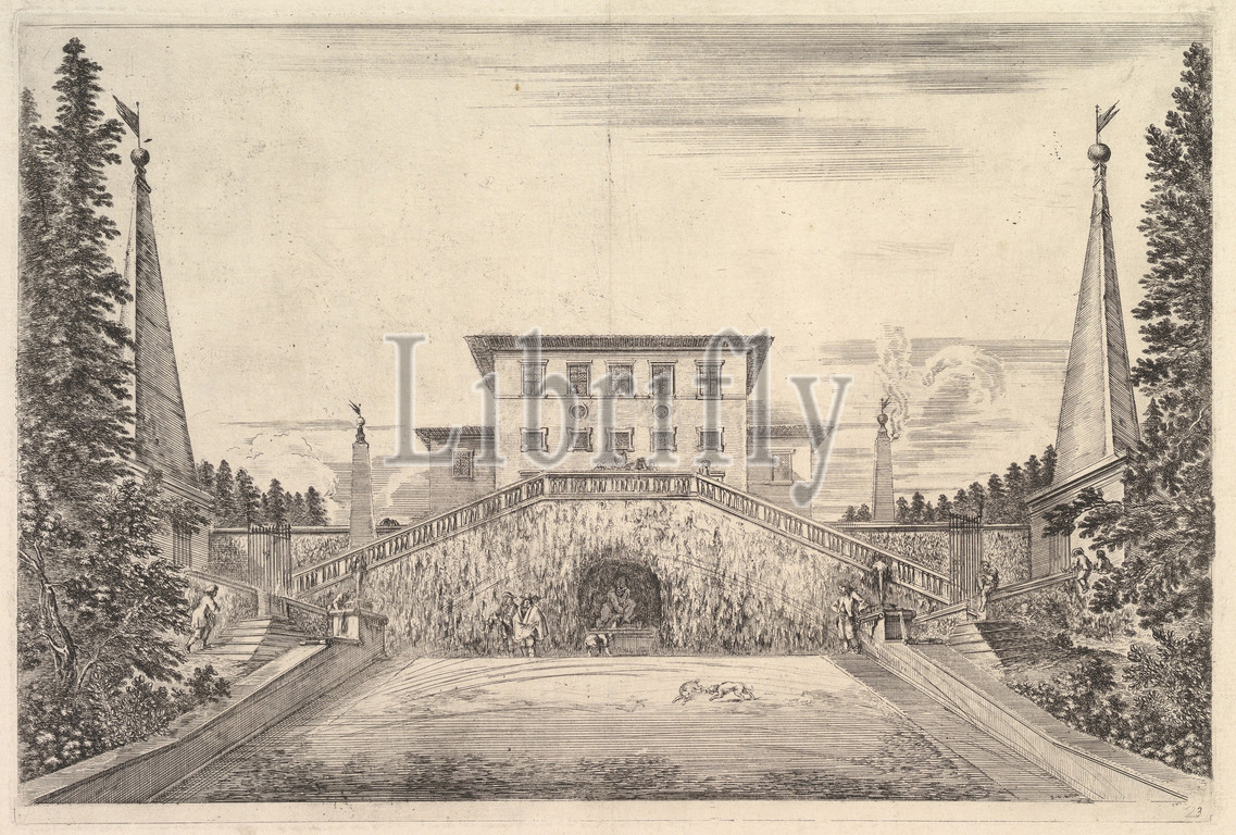 villa, center flanked, four obelisks, staircase, side, statue, niche, center, staircases, various figures, dogs, Views, Pratolino, Vues de la villa Pratolino, ca, 1653, Etching, Sheet, 13 9/16 x 18 9/16, 34.5 47.1 cm, Stefano della Bella, Italian, Florence, 1610–1664
