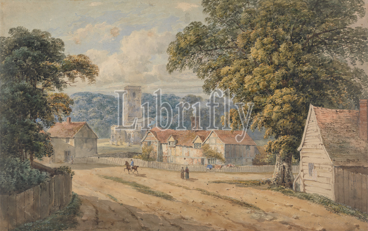 Village, Aldbury, Hertfordshire, George Shepheard, ca, 1770–1842, British, 1816, Watercolor, pen, black ink, gouache, graphite, thick, slightly textured, cream wove paper, Sheet, architectural subject, chimneys, church, fence, genre subject, horse, animal, houses, landscape, men, road, town, trees, village, walking, women, Aldbury, England, Europe, Hertfordshire, United Kingdom