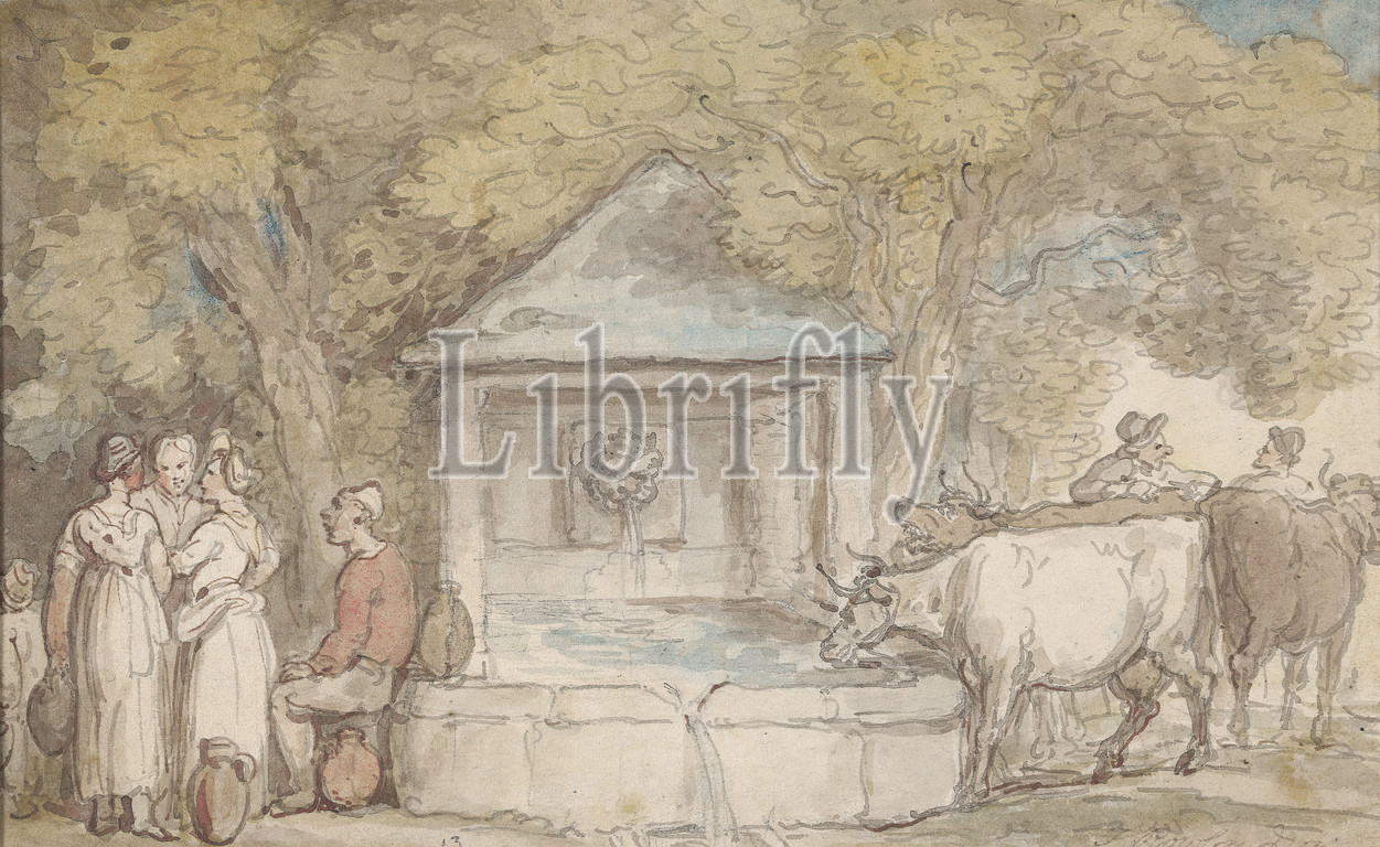 A Village Fountain, Thomas Rowlandson, 1756–1827, British, undated, Watercolor with pen and brown ink, gray ink, and graphite on medium, slightly textured, cream, wove paper, Sheet: 4 7/16 × 7 3/16 inches (11.3 × 18.3 cm), Contemporary drawn border: 5 5/8 × 8 7/16 inches (14.3 × 21.4 cm), and Mount: 12 11/16 × 16 1/4 inches (32.2 × 41.3 cm)
