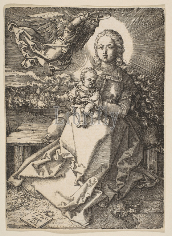 Virgin, Child Crowned, Angel, 1520, Engraving, Sheet, 1 7/16, 3 7/8, 3.7, 9.8 cm, Prints, Albrecht Dürer, German, Nuremberg, 1471–1528