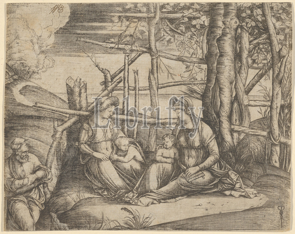 Virgin, Child, Saint Elizabeth, John, Baptist, landscape, St Joseph, left, ca, 1503, Engraving, plate, 5 1/16 x 6 5/16, 12.9 16.1 cm, trimmed, slightly irregular, Prints, Jacopo de' Barbari, Italian, active Venice by, 1497–died, 1516, Mechelen or Brussels