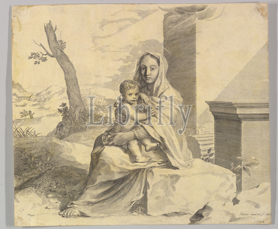 Virgin, Child Seated, Rock, Vierge à l'Enfant dans des ruines, 1659, Engraving, sheet, 12 1/2 x 14 1/2, 31.7 36.8 cm, Prints, Claude Mellan, French, Abbeville, 1598–1688, Paris