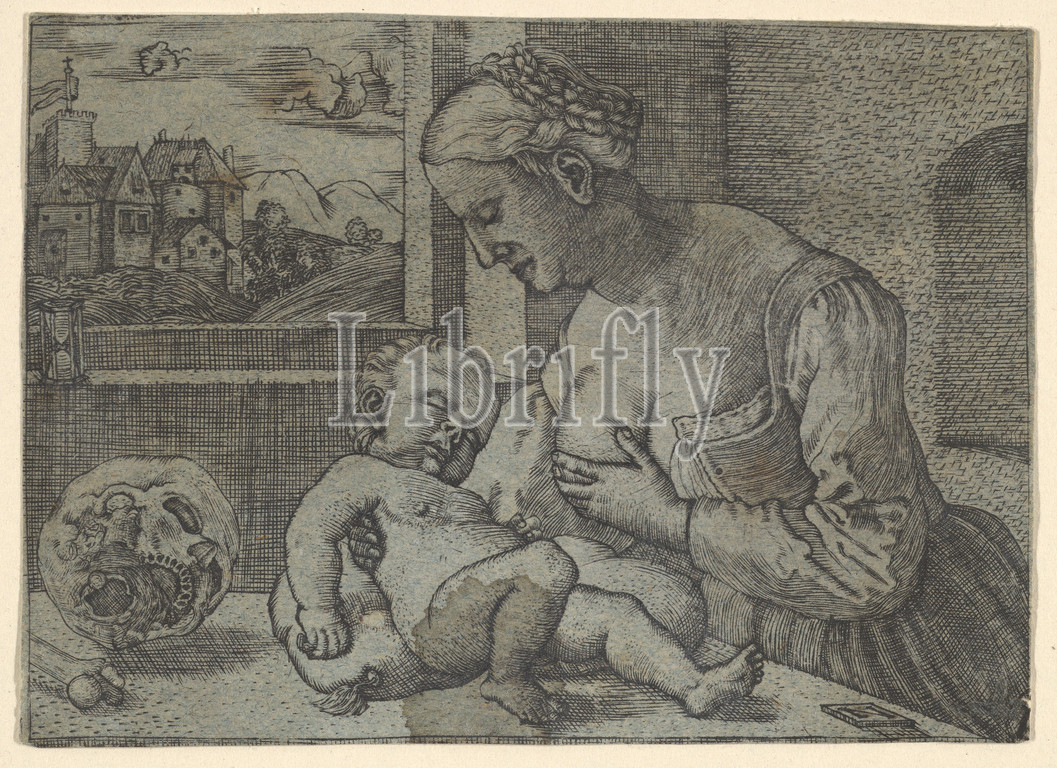 Virgin, Child, Skull, copy, 16th century, Engraving printed, blue paper, Sheet, 2 3/4 x 3 7/8, 7 9.8 cm, Prints, After Barthel Beham, German, Nuremberg ca., 1502–1540, Italy, Nikolaus Wilborn, active, 1531–63