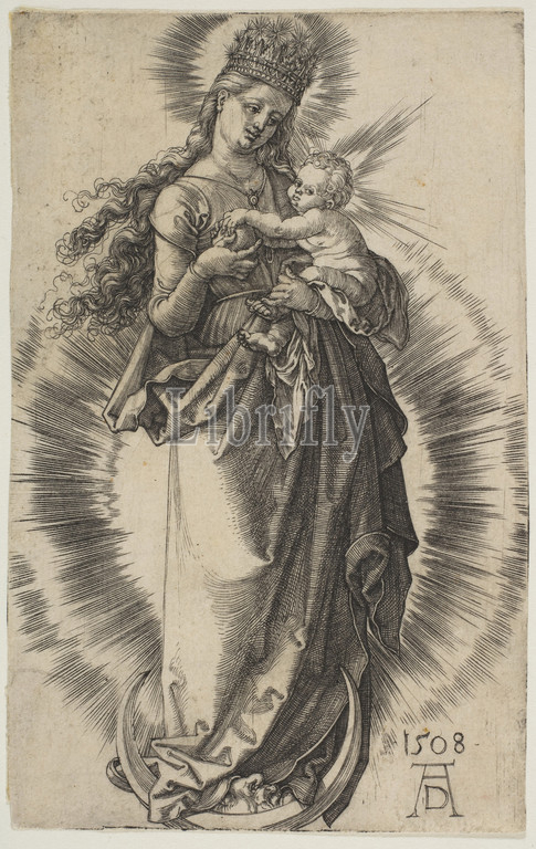 Virgin, Crescent, Starry Crown, 1508, Engraving, Sheet, 5, 2 15/16, 12.7, 7.4 cm, Prints, Albrecht Dürer, German, Nuremberg, 1471–1528
