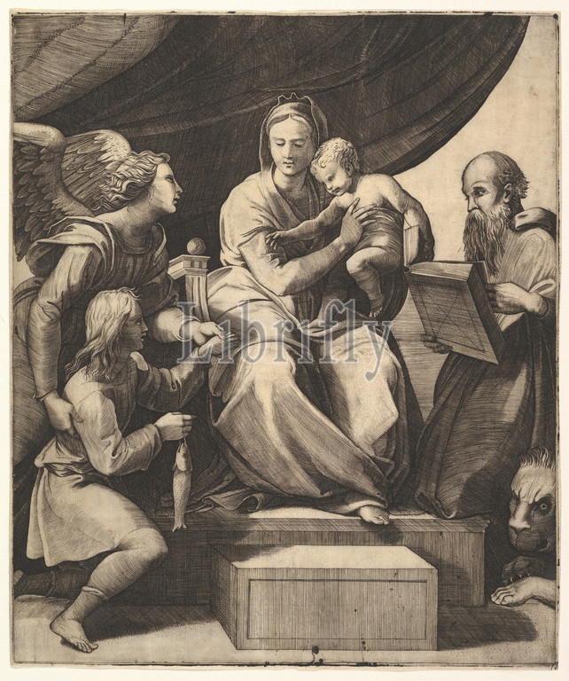 The Virgin of the Fish, ca. 1515–27, Engraving, 10 1/4 x 8 9/16 in. (26.1 x 21.8 cm), Prints, School of Marcantonio Raimondi (Italian, Argini (?) ca. 1480–before 1534 Bologna (?)), or Marco Dente (Italian, Ravenna, active by 1515–died 1527 Rome), After Raphael (Raffaello Sanzio or Santi) (Italian, Urbino 1483–1520 Rome)