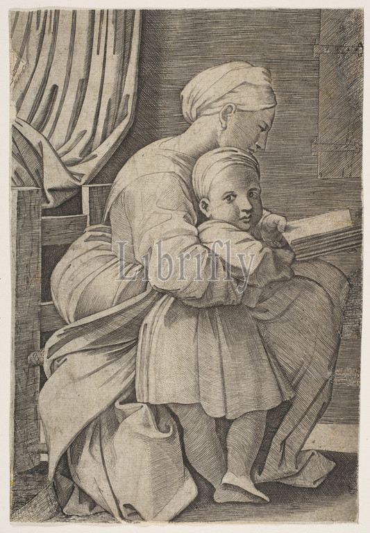 Virgin, profile facing right reading, infant Christ, ca, 1515–27, Engraving, Sheet, Trimmed, 7 7/16, 5 3/16, 18.9, 13.1 cm, Prints, Attributed to Marco Dente, Italian, Ravenna, active by, 1515–died, 1527, Rome, After Raphael, Raffaello Sanzio or Santi, Urbino, 1483–1520