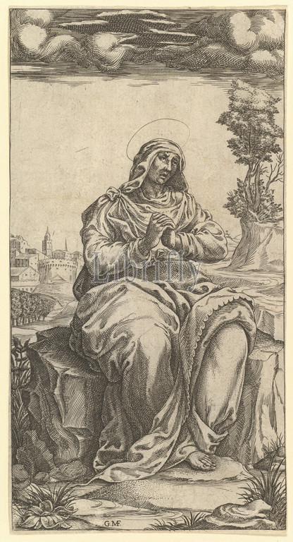 The Virgin of Sorrows; central part of a print with nine surounding compartments, now separated, by 1575, Engraving, Sheet: 8 3/8 × 4 7/16 in. (21.2 × 11.2 cm), Prints, Engraved by Giorgio Ghisi (Italian, Mantua ca. 1520–1582 Mantua)