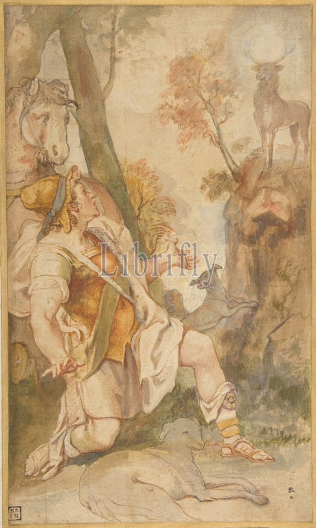 Vision, Saint Eustace, 1542–1609, Point, brush, brown, gray, green, yellow, red wash, highlighted, white, traces, red, black chalk, Lightly squared, 13 7/16 x 7 15/16in, 34.1 20.2cm, Drawings, Federico Zuccaro, Zuccari, Italian, Sant'Angelo in Vado, 1540/42–1609, Ancona, Created, Federico, under, tutelage, elder brother Taddeo, 1529-1566, drawing, model, frescoes, decorated, façade, house, Piazza San, Eustachio, Rome