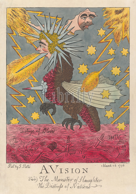 Vision, Vide, Monster, Slaughter, Distress, Nations, Deluge, Blodd, Print, William O'Keefe, active 1794–1807, 1796, Etching, hand coloring, watercolor, medium, slightly textured, cream laid paper, Plate, Image