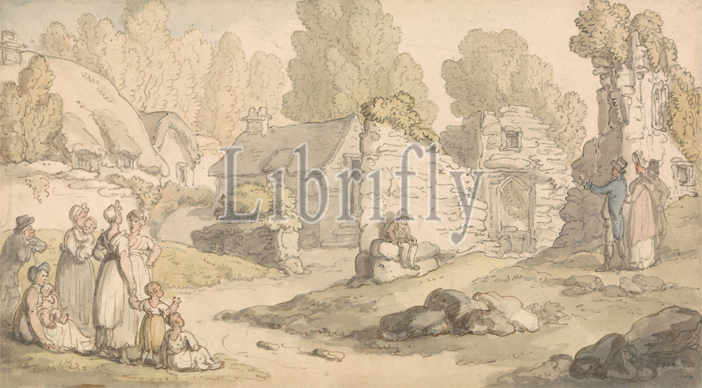 Visitors Inspecting Abbey Ruins, Thomas Rowlandson, 1756–1827, British, undated, Watercolor with pen and gray ink, and pen and red ink, over graphite on medium, slightly textured, cream wove paper, Sheet: 5 1/2 x 9 7/8 inches (14 x 25.1 cm), abbey, architectural subject, cottages, inspecting, landscape, people by activity, road, rocks (landforms), rocks (landforms), ruins, trees, visitors