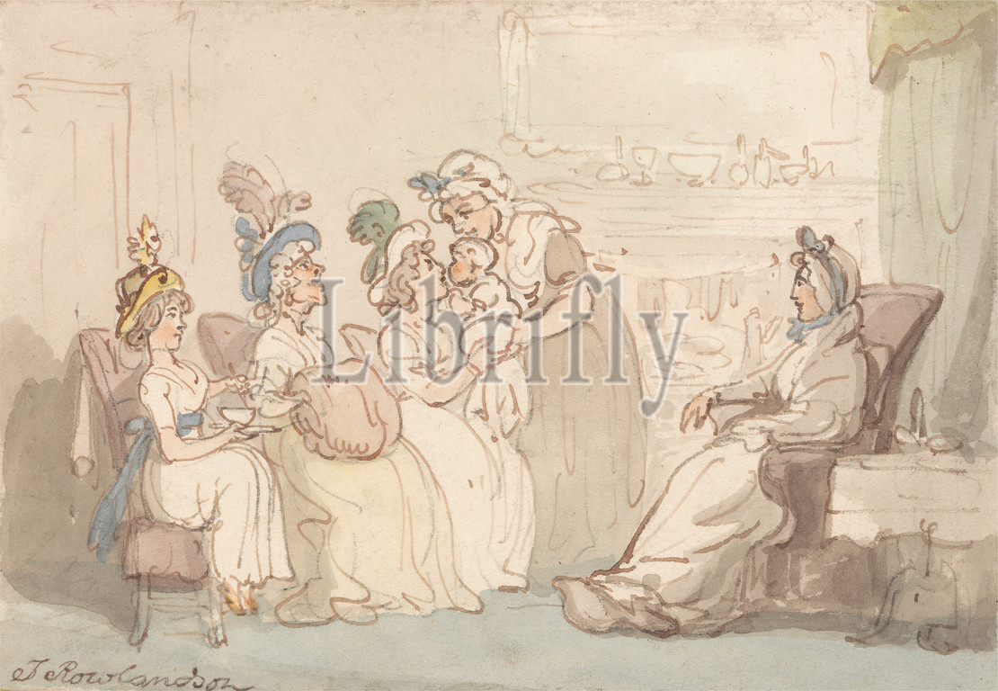 Visitors, Shown, Baby, Thomas Rowlandson, 1756–1827, British, Watercolor, pen, red-brown ink, graphite, medium, slightly textured, blued white, wove paper, Sheet, baby, bonnets, hats, children, feathers, genre subject, hats, muffs, sitting rooms, table, support furniture, visitors, women
