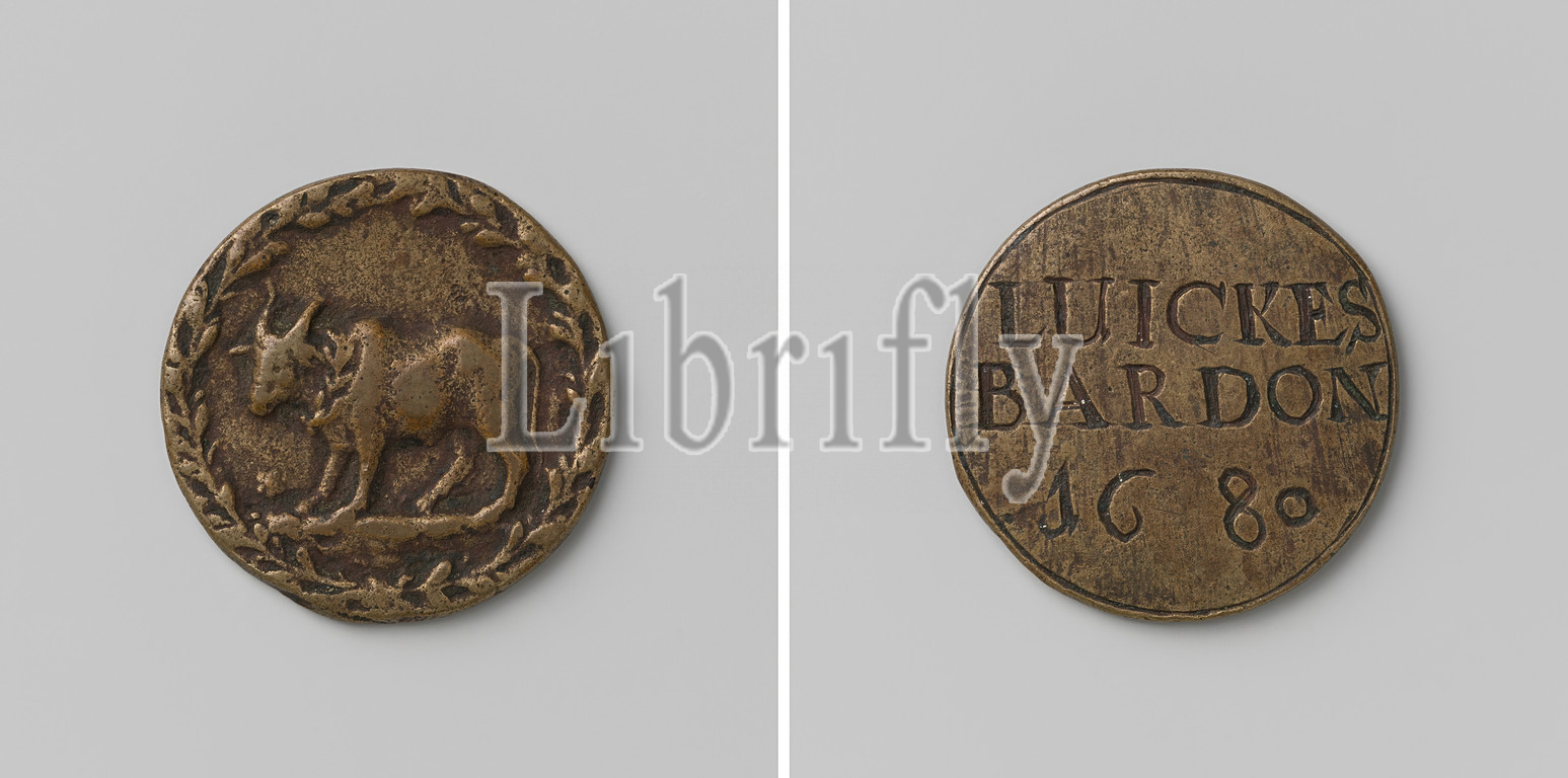 Vleeshouwers Guild of Amsterdam, Guild Medal of Luickes Bardon, Brass Medal. Front: left used bull inside wreath. Reverse: inscription, Amsterdam, Luickes Bardon, anonymous, 1686, brass (alloy), engraving, d 3.3 cm × w 14.36 gr