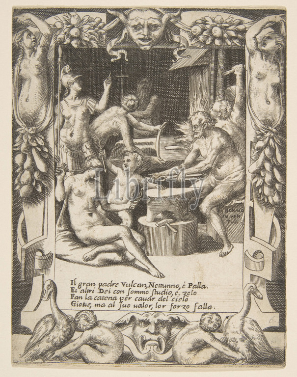 Vulcan, Neptune, Athena and other Gods making Shackles to pull Jupiter from the Heavens, set within an elaborate frame, from 'Loves, Rages and Jealousies of Juno', 1531–76, Engraving, sheet: 5 5/16 x 4 in. (13.5 x 10.2 cm), Prints, Giulio Bonasone (Italian, active Rome and Bologna, 1531–after 1576)