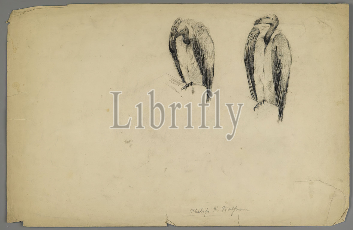 Vultures, Philip H. Wolfrom, American, 1870-1904, Charcoal, paper, n.d., Sheet, 12 7/8 x 19 3/4, 32.7 x 50.2 cm, beak, birds, drawing, isolation, pair, patience, sketch, vultures, waiting, wings