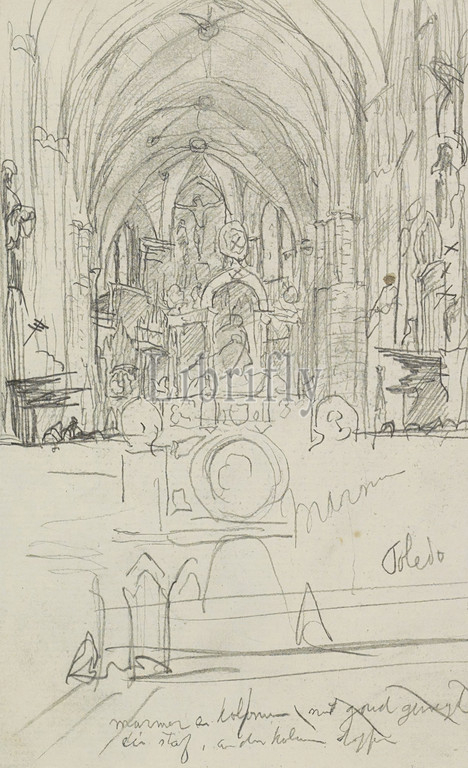 wall, statue, Christ, cross, Page 27, sketchbook, 30 pages, Interior, Cathedral, Toledo, draughtsman, Marius Bauer, Toledo, 1902, Marius Bauer, 1902
