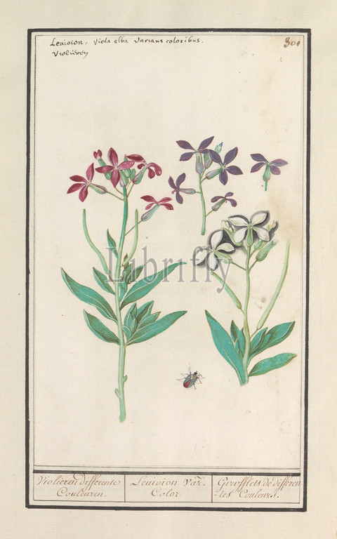 Wallflower, Erysimum cheiri, Violieren differente Couleuren, Leuioion var, Color, Girofflets de differentes Couleurs, title, object, Red, purple wallflower, beetle, Numbered top right, 301, Top left, Latin, Dutch name, Part, fourth album, drawings, flowers, mushrooms, Eleventh, twelve albums, animals, birds, plants, 1600, commissioned, Emperor Rudolf II, explanations, Dutch, French, insects, Anselmus Boetius de Boodt, 1596, 1610, paper, watercolor, paint, deck paint, chalk, ink, pen