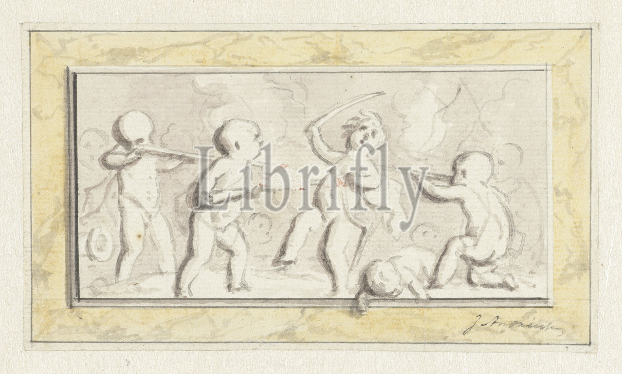 Warring putti, Design for a painting., Minerva as patroness, art, symbolic representations, allegories and emblems, science, 'Scientia', 'Scienza', 'Studio' (Ripa), Holland, Lodewijk Napoleon Bonaparte, Jurriaan Andriessen, c. 1752 - c. 1819, paper, watercolor (paint), ink, graphite (mineral), brush, h 97 mm × w 170 mm