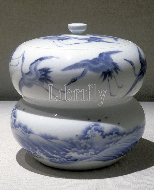 water jar, mizusashi, cranes, waves design, Edo, 1800s, porcelain, underglaze blue, 6-3/4 x 6-3/4, diam, Asian Art