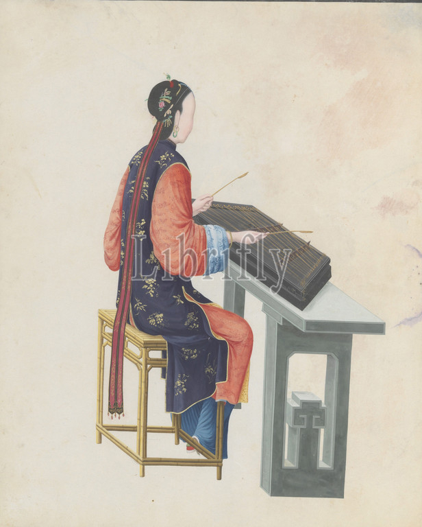 Watercolor of musician playing yangqin, late 18th century, China, Chinese, Watercolor on paper, Overall: 43.2 x 35.6 x 1.3cm (17 x 14 x 1/2in.), Works on Paper