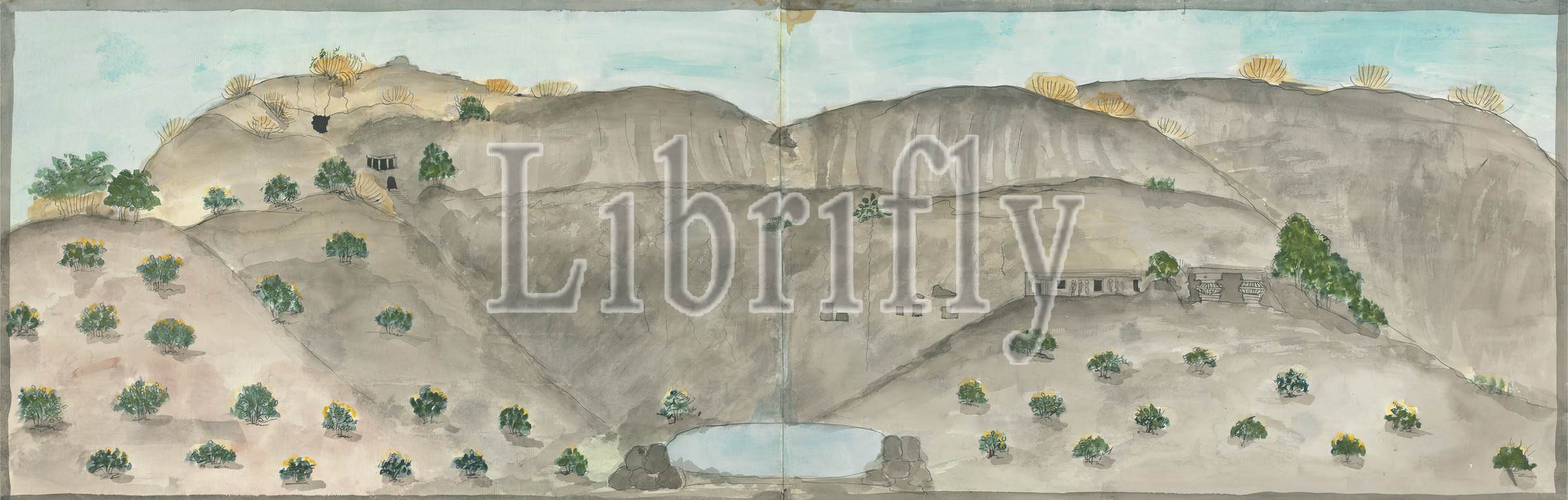 The Waterfall of Doomar Leyna, Dry Except in Rains, Attributed to Gangaram Chintaman Tambat, active 1790s, Anglo-Indian, undated, Watercolor, pen and black ink, and graphite on medium, slightly textured, cream laid paper, Sheet: 11 × 33 3/4 inches (27.9 × 85.7 cm)