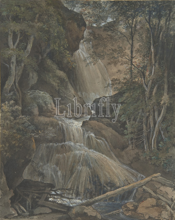 A Waterfall in a Forest at Langhennersdorf, 18th–early 19th century, Brush and brown ink, watercolor, gouache, over a sketch in graphite, sheet: 9 5/16 x 7 7/16 in. (23.7 x 18.9 cm), Drawings, Christoph Nathe (German, Nieder-Bielau 1753–1806 Schadewalde)
